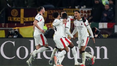 ROME, ITALY – JANUARY 25: Koni De Winter of AC Milan celebrates with teammates after scoring his team’s first goal…